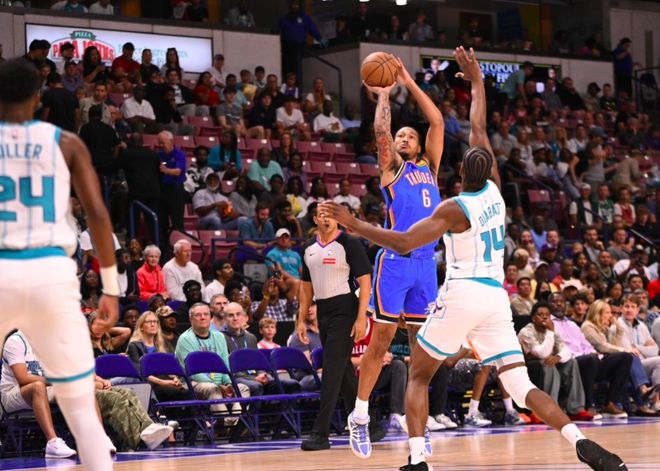 北京时间10月6日,NBA季前赛继续展开,卫冕冠军雷霆对阵黄蜂。本场比赛雷霆首发五人全都缺席,可上来他们状态十分火热,两队防守强度也不大,维金斯帮助球队占据主动,半场领先13分;下半场雷霆延续火热的状态,完全压制着黄蜂,将分差拉开到20分以上。最终,雷霆135-114大胜黄蜂,取得了季前赛的开门红。
